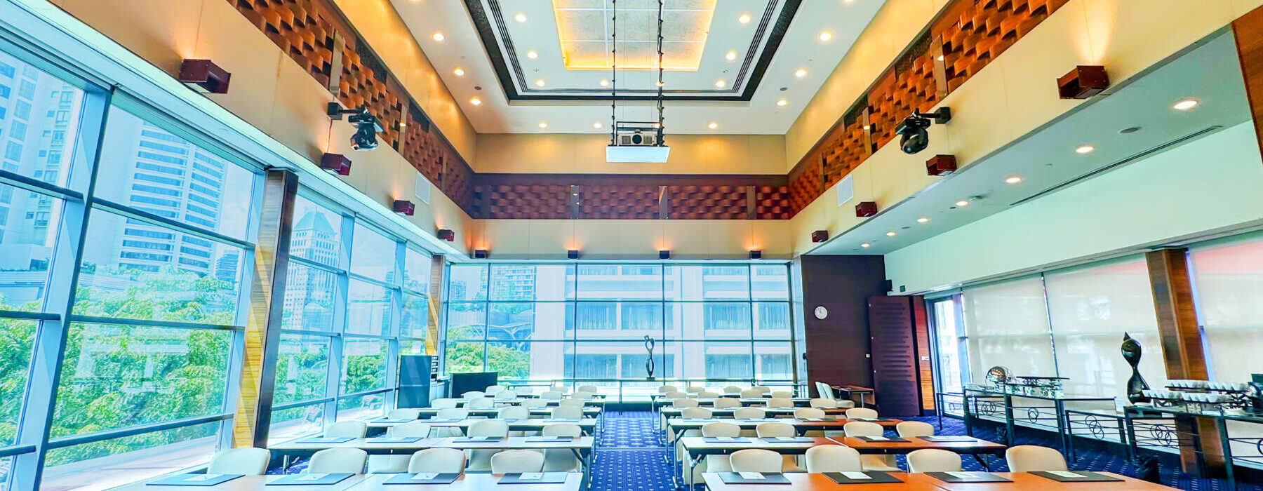 高い天井と柱のないオープンスペースにオーチャードロードの緑の眺望とプールサイド・テラス(カクテルに最適)バルモラル・ホールはスペースに特別を求める方々に。50名から120名様まで収容可能。